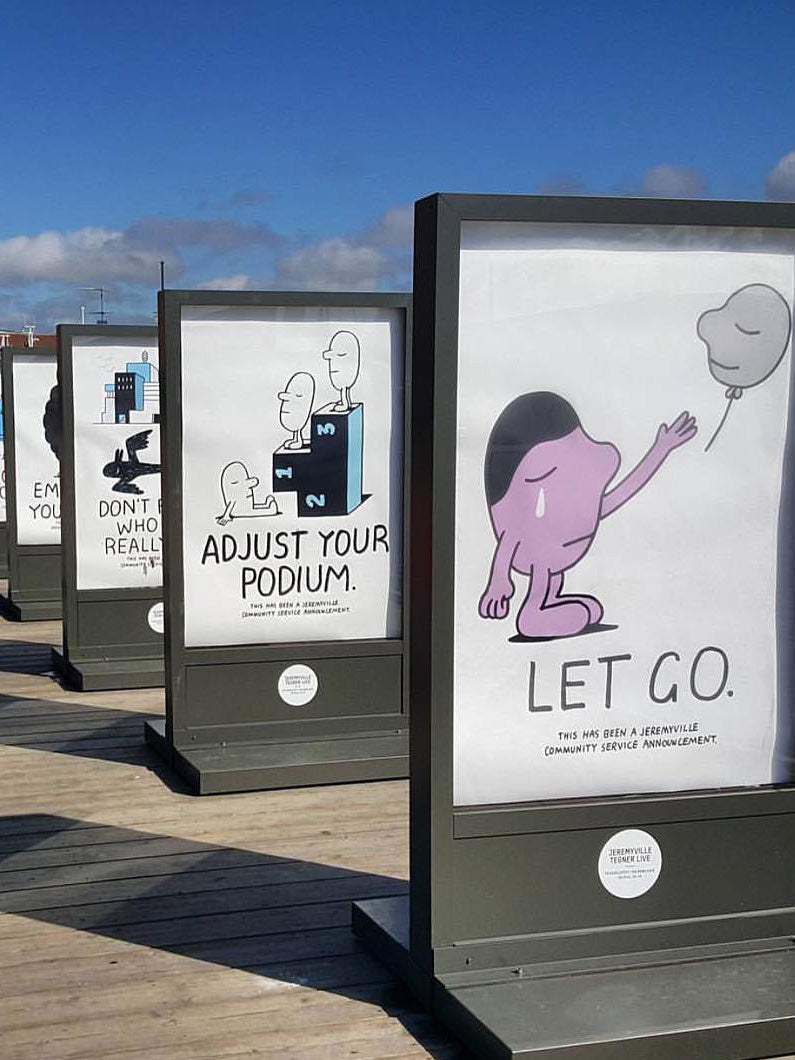 A TRIP TO JEREMYVIILLE is our Studio's ongoing public art installation & interactive sculpture experience. Through each project, our intention is to share our philosophy, & to instigate small changes in the world. The characters that champion the 8 pillars of our philosophy, include Raymundo, Jebediah 'Shroom, Jethro Bunny, Forever Flowers, the JV Running Club, the JV Stretching Club, Sonny, Furry McFurry, The Forever Family, and the Meditation Crew.